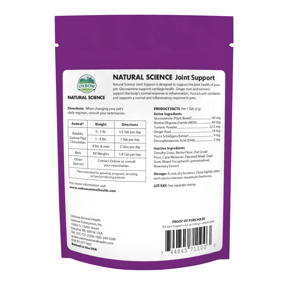 Product Facts Per 1 Tab (2 g) Active Ingredients: Glucosamine (Plant Based): 90 mg, Manna Oligosaccharide (MOS): 40 mg, Turmeric Powder: 22.5 mg, Ginger Root: 18 mg, Yucca Schidigera Extract: 9 mg, Docosahexaenoic Acid (DHA): 2 mg Inactive Ingredients: Timothy Grass, Barley Flour, Oat Groat Flour, Cane Molasses, Flax Seed Meal, Guar Gum, Mixed Tocopherols (preservative), Rosemary Extract.